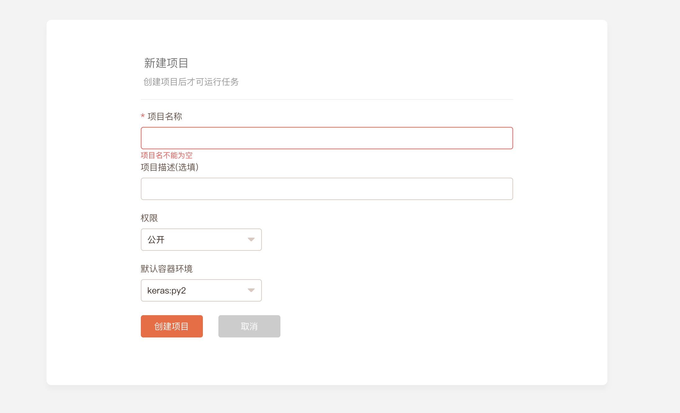 点击 新建项目 后进入创建页,填写 项目名、项目描述(可选),并选择 权限、默认容器环境。