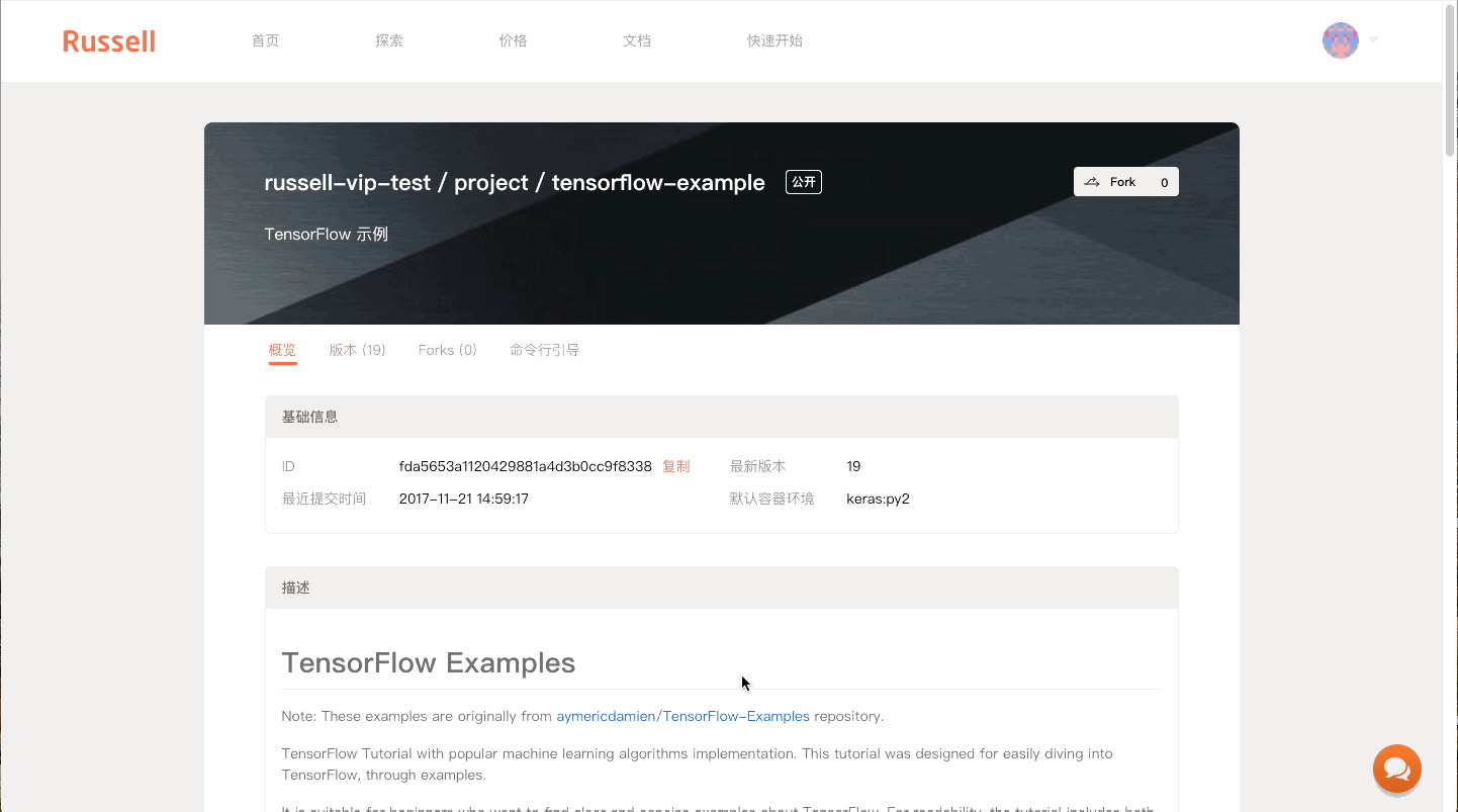 如果你使用过GitHub 的话应该知道 README.md 的用法,同样的,RussellCloud 支持自动加载 README,你只需要在项目目录下创建 README.md 并按照 MarkDown 规范(与 github 一致)写入内容,在你下一次 run 时,README文件就会自动上传并在 [项目页-描述] 模块中加载。